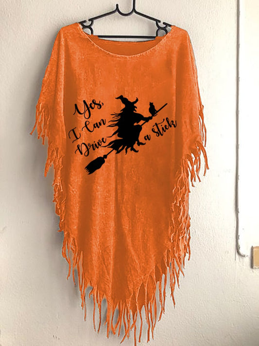 Women's Funny Halloween Witch Yes Actually I Can Drive A Stick Fringed Top
